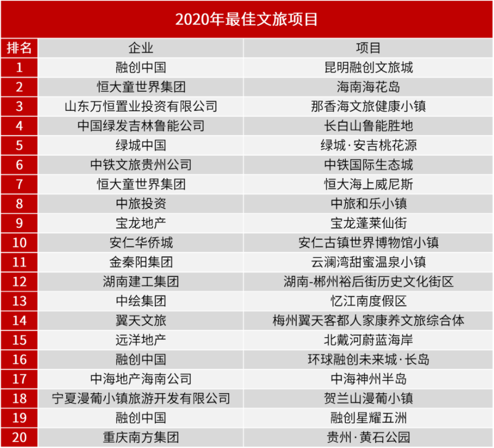 根据文旅行业官方指向标“TRUE文旅超级评价榜”权威公布,该榜单由中国房地产业协会商业和文化旅游地产委员会、易居克尔瑞、克尔瑞乐苇、微博房产等单位联合评选,全国超过70个城市、200个优质项目参与。2020年最佳文旅项目如下表: