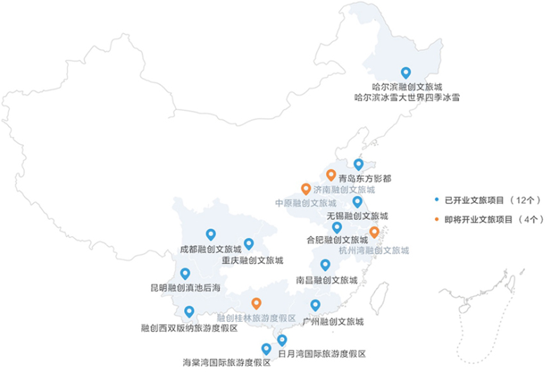 2019年底,融创文旅已布局10座文旅城、4个旅游度假区、26个文旅小镇,其中涵盖41个主题乐园、46个商业及近100家高端酒店。