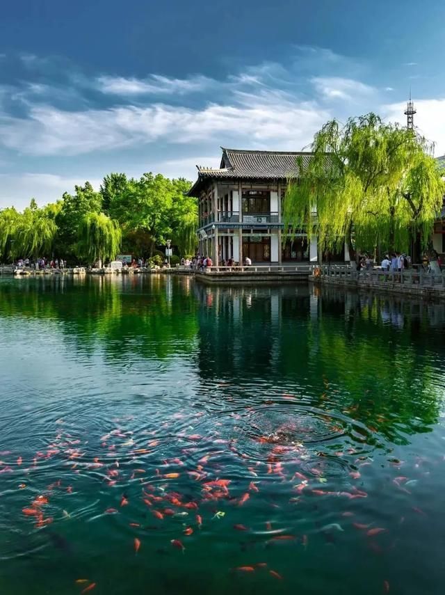 五龙潭,是济南最深的一处泉水,水流常年不涸。水面宽阔,澄澈如镜,潭边曲栏画桥,亭台楼阁,倒映潭中,恍如仙境。