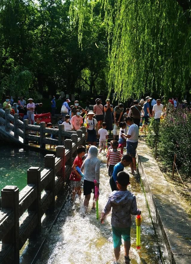 每到夏季,高大的树木和浓密的枝叶,隔绝了太阳的炙烤,大片的树荫下,清冽的泉水没过青石板。人们在这里尽情享受与自然接触的乐趣。