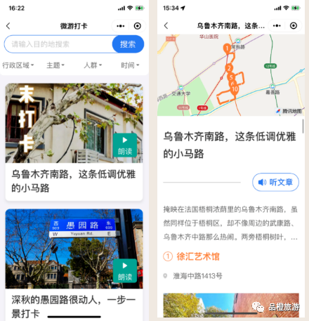 为保障各类人群平等便捷地通过微信小程序获取资讯信息,解决老年人和部分视障人士阅读浏览不方便问题,“乐游上海”将“当季推荐”“微游打卡”“非遗拾萃”“博物探秘”和“上海老字号”板块中的推送文章和景点路线优化为语音讲解模式,老年人可以直接在首页选择“朗读”模式,也可以在进入详情页后点击“听文章”模式。线上语音讲解与线下景区导览的融合体验,进一步提升了老年人的旅游感受,让老年人也享受到数字化带来的便利。