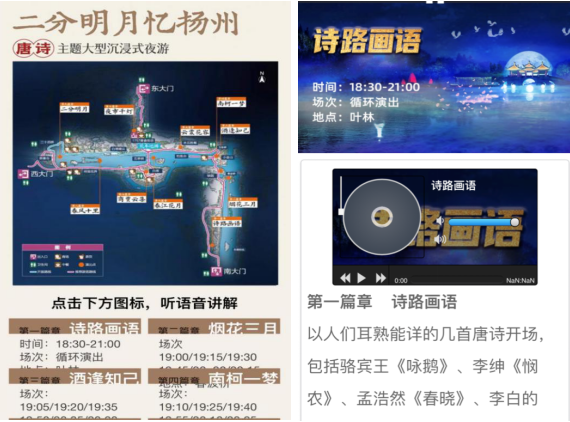 结合智慧景区打造,瘦西湖联合电信、移动铺设园区5G网络,覆盖率达到97.26%。今年景区利用5G网络的覆盖,结合夜游项目的开展,开发并推出夜游电子导览、语音讲解,扫描二维码即可进入电子导览。景区充分考虑到老年游客的具体情况,导览界面干净清爽,层级菜单设置合理,采用可调节字体大小和简单易懂的图示,简化了操作的流程,让老年游客可以根据自己的兴趣点,快捷找到所需内容。沿途自动语音播报,在游览中同步播放讲解词,让老年游客可以沉浸在瘦西湖夜游十大篇章的各项演出中,领略瘦西湖夜游的美,让游览过程更加“丝滑”,真正实现一部手机玩转夜游。
