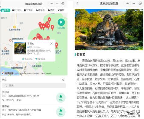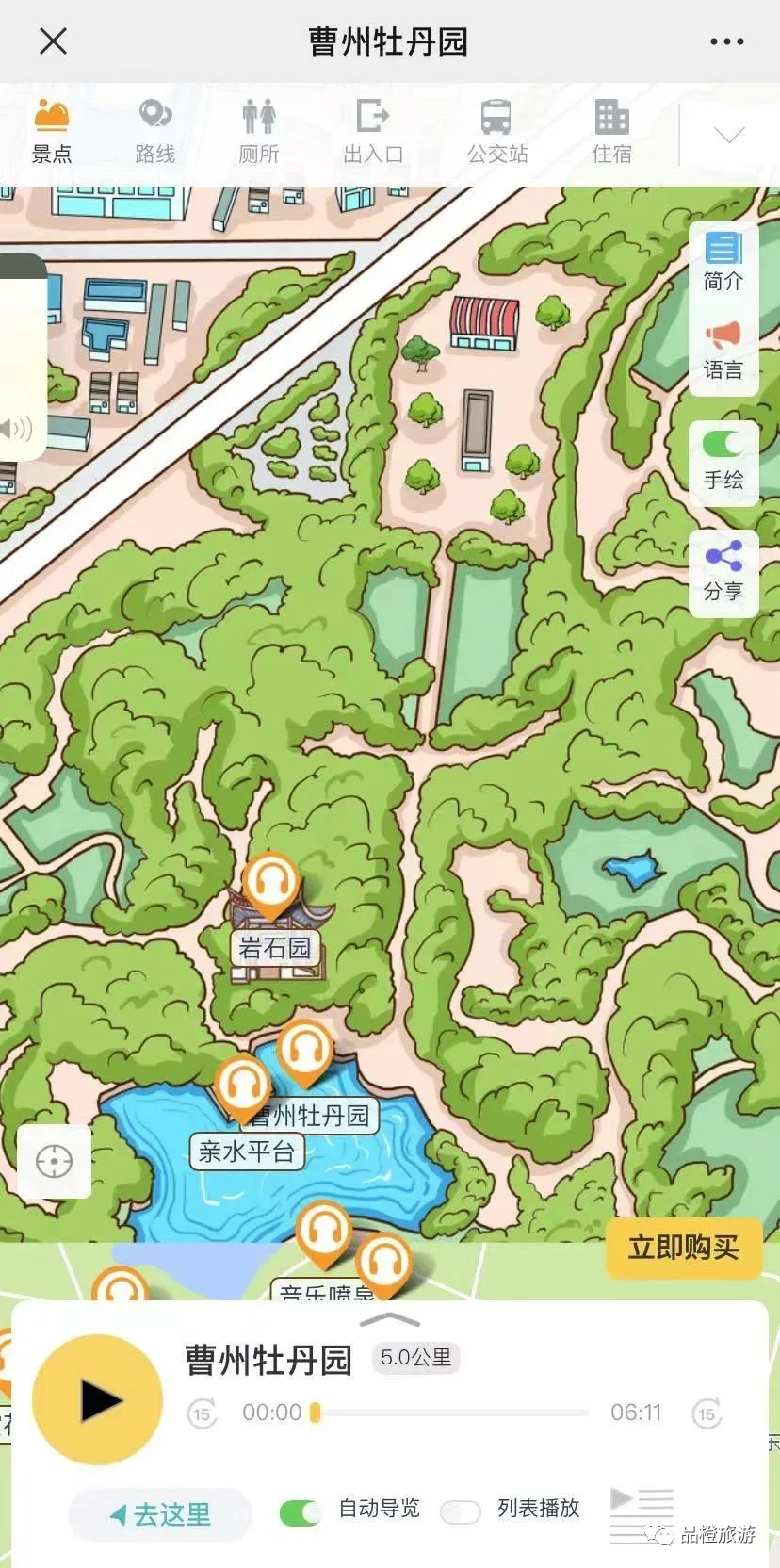 游客通过“曹州牡丹园景区”公众号、微信小程序,可实现在景区内的智慧导览。曹州牡丹园景区占地1200亩,面积较大,为进一步做好智慧化适老服务工作,景区开发了智慧导览系统,一部手机实现语音导览、路线选择、厕所提示、出入口提示、游客服务中心位置提示等内容,操作简单、便捷,适于老年人使用。同时,在老年人无智能手机或不会操作的情况下,景区所有道路在关键位置设有户外电子导览图,可实现“一键语音查询”、语音播报等功能。