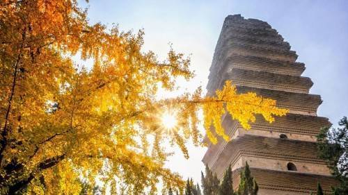 清凉的钟声、秀丽的塔影、金黄的银杏,目光所及都是一片金黄,踏着满地的落叶,看着美艳的银杏树叶与质朴的小雁塔相互映衬,仿佛穿越千年,古韵十足。
