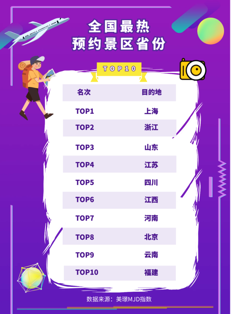 根据美璟MJD指数显示,目前全国已有3000多家景区可在线预约入园。上海、浙江、山东、江苏、四川、江西、河南、北京、云南、福建成为预约景区最多的省份。