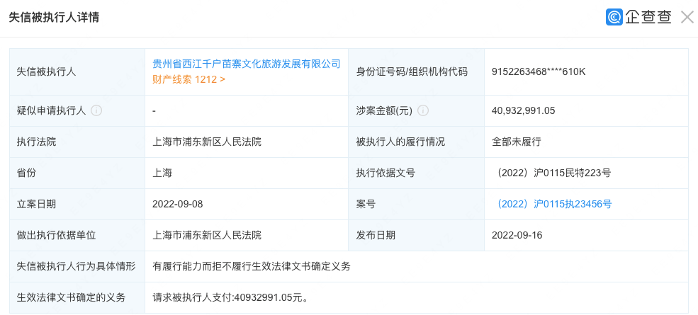企查查信息显示,9月16日,上海市浦东新区人民法院发布了一条执行依据为(2022)沪0115民特223号的失信被执行人信息,因对案号为(2022)沪0115执23456号的执行案件全部未履行,贵州省西江千户苗寨文化旅游发展有限公司沦为失信被执行人。