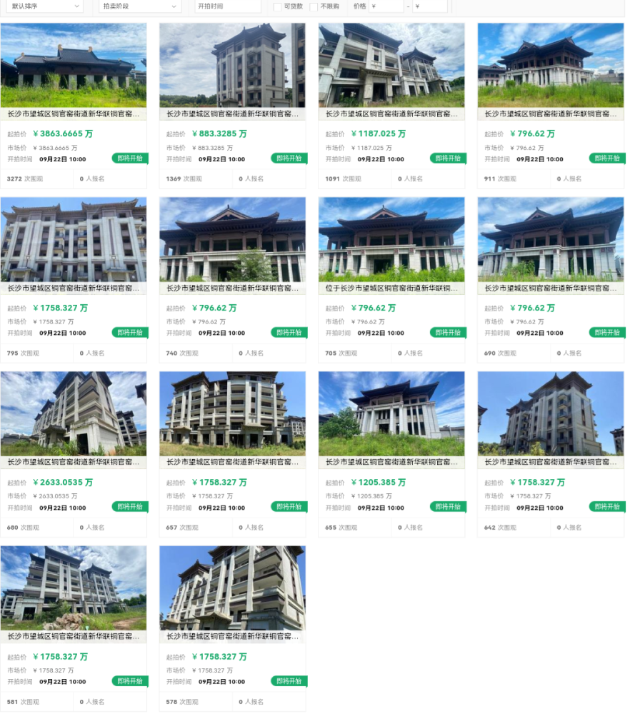 来自阿里资产司法拍卖的信息显示,长沙市望城区铜官窑街道新华联铜官窑文华旅游园多套房产将于9月22日启动首次拍卖,上述房产被分成了14个资产包,总起拍价超2亿元。