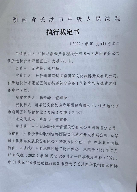 信息显示,此次拍卖源于2022年8月8日湖南省长沙市中级人民法院出具的编号为(2022)湘01执642号之二申请执行人为的执行裁定书,其申请执行人为中国华融资产管理股份有限公司湖南分公司,被执行人为长沙新华联铜官窑国际文化旅游开发有限公司。