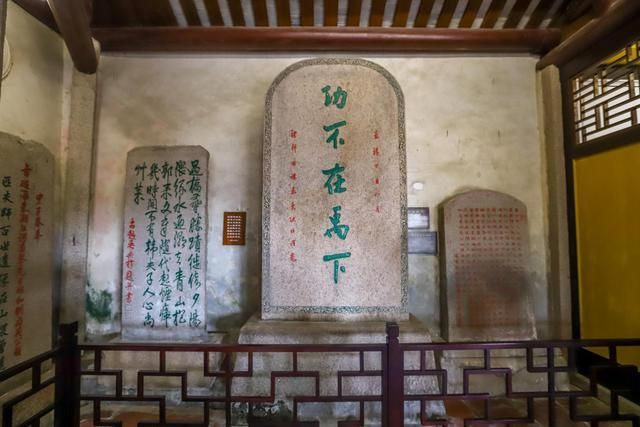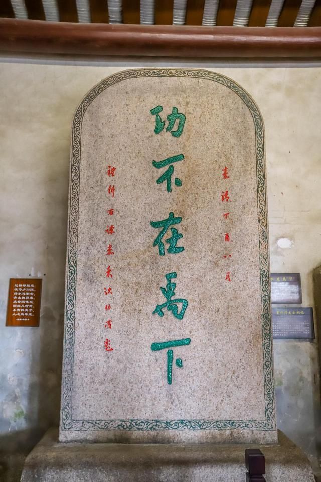 在韩文公祠里面有一块石碑,上书:《功不在禹下》。上面的字是取自韩愈的文章。韩愈认为他在神权、皇权的双重统治下治人的思想比治水还艰难,借此称赞孟子传播儒家思想的功绩不比大禹治水低。于是后人引用他曾写过的文章《功不在禹下》来赞颂他来潮州任刺史期间,置办学校,在潮州兴学育才的功绩。