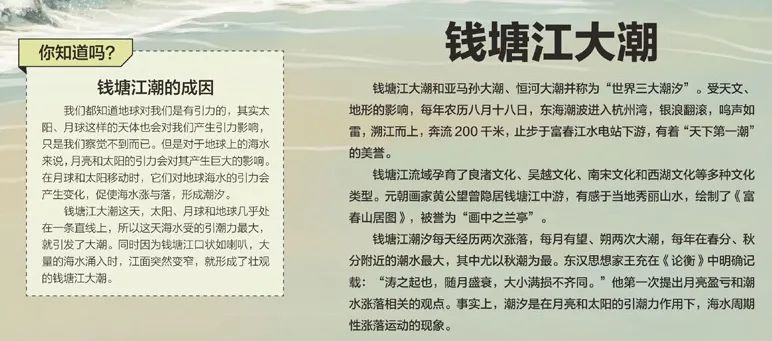 比如讲到钱塘江大潮,让你不仅知道每年都有两次大潮,还用专业的地理知识和图例,向你展示大潮形成的原因。