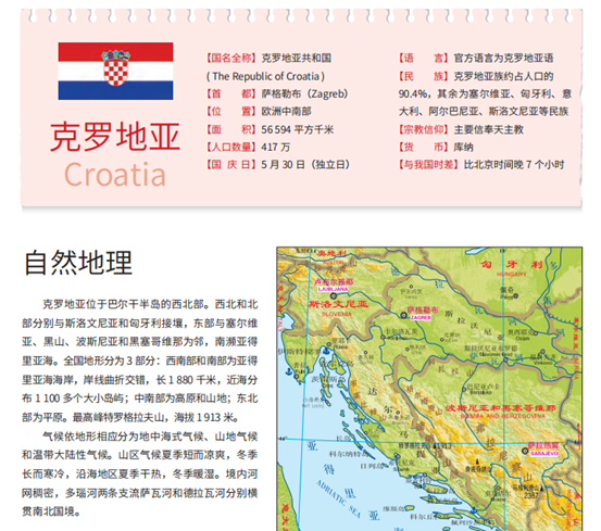 克罗地亚是一个什么样的国家呢?一套好书帮你得到答案。《藏在地图里的世界百科》欧洲第2册的第17页就能看到关于克罗地亚的介绍,它是位于巴尔干半岛西北部的东欧国家,曾经是南斯拉夫社会主义联邦共和国的一员。看到它的国旗就会知道为什么克罗地亚的球衣是红白方格相间的图案。
