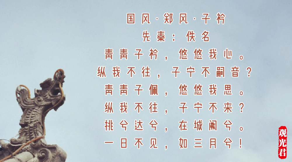 《国风·郑风·子衿》是中国古代第一部诗歌总集《诗经》中的一首诗。全诗三章,每章四句。此诗写单相思,描写一个女子思念她的心上人。每当看到颜色青青的东西,女子就会想起心上人青青的衣领和青青的佩玉。于是她登上城门楼,就是想看见心上人的踪影。如果有一天看不见,她便觉得如隔三月。全诗采用倒叙的手法,充分描写了女子单相思的心理活动,惟妙惟肖,而且意境很美,是一首难得的优美的情歌,成为中国文学史上描写相思之情的经典作品。