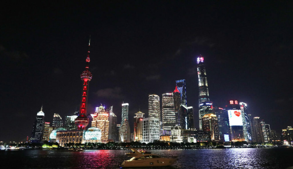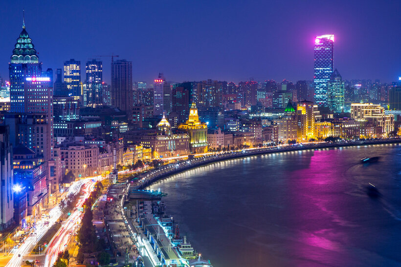 黄浦江东岸是浦东,被认为是中国的主要金融和商业区。当建筑物的灯光在水中反射时,夜晚看起来很棒。