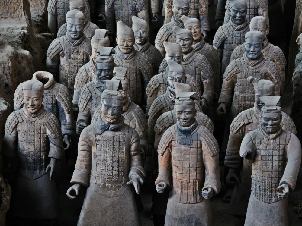 统治者秦始皇在他13岁的时候,开始建造他的寝陵。这位年轻的皇帝说服他的大臣们,在他死后不要让士兵给他殉葬,他让用泥塑代替他们。这就是兵马俑的来历,每个人的面孔都不同。活着的宾妃和宝藏被统治者埋葬了。这位中国皇帝的陵墓建设超过了38年。这个陵墓在1974年被发现,之后被列入联合国教科文组织遗产名录。