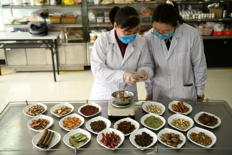 在河北省石家庄市洛杉奇食品有限公司,河北省非物质文化遗产“金凤扒鸡”第五代传承人董兰坤(左)调配十八味辅料。新华社发(许建园 摄)