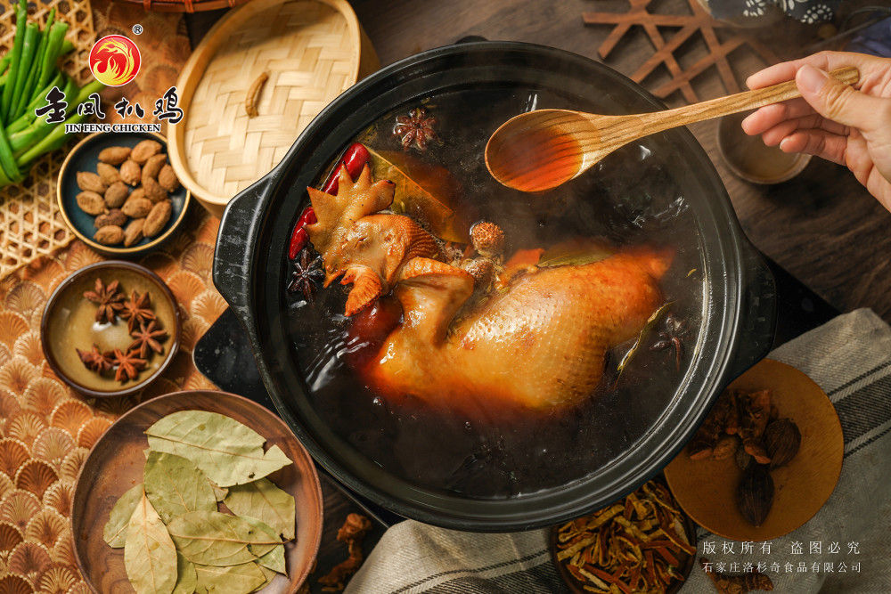 金凤扒鸡经过对原料鸡的精挑细选,再通过冲洗、整理、捌制、造型等多道工序后入锅,用经过科学测定和严格控制的油温将产品炸至金黄色,再利用百年老汤佐以十八味名贵中草药焖煮十几个小时以上(其中不添加任何防腐剂)制作而成。