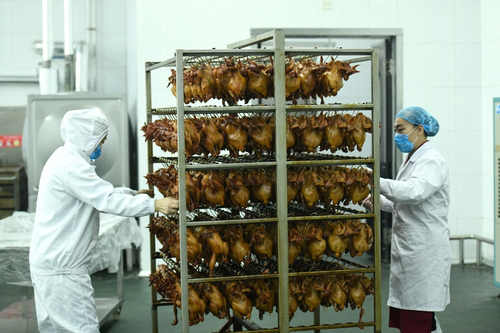 在河北省石家庄市洛杉奇食品有限公司,工作人员将制作好的鸡体进行晾制。新华社发(许建园 摄)