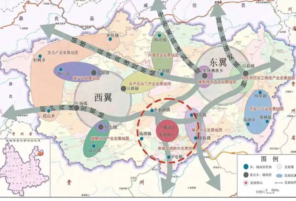 4.十组团:杉树—碗厂生态产业发展组团、坪上—以古磷产业发展组团、五德—坪上农产品加工产业发展组团、芒部—雨河白酒产业发展组团、以勒现代商贸加工物流产业发展组团、果珠煤炭物流产业发展组团、鱼洞—母享—黑树页岩气产业发展组团、塘房—泼机煤电产业发展组团、县城产城融合发展组团、坪上—以古磷煤化工产业发展组团。
