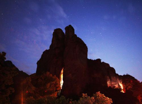 这里有著名景观“景星望月”,在三面绝壁的悬崖尖上的亭子里观看月色,可以看到比平时大一倍的月亮。