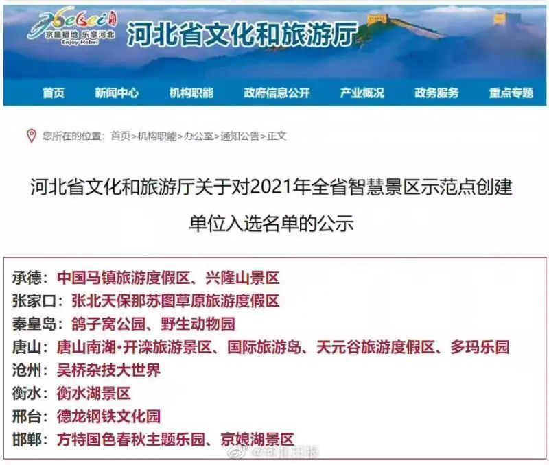 ● 河北14家景区入选2021年全省智慧景区示范点创建单位名单。