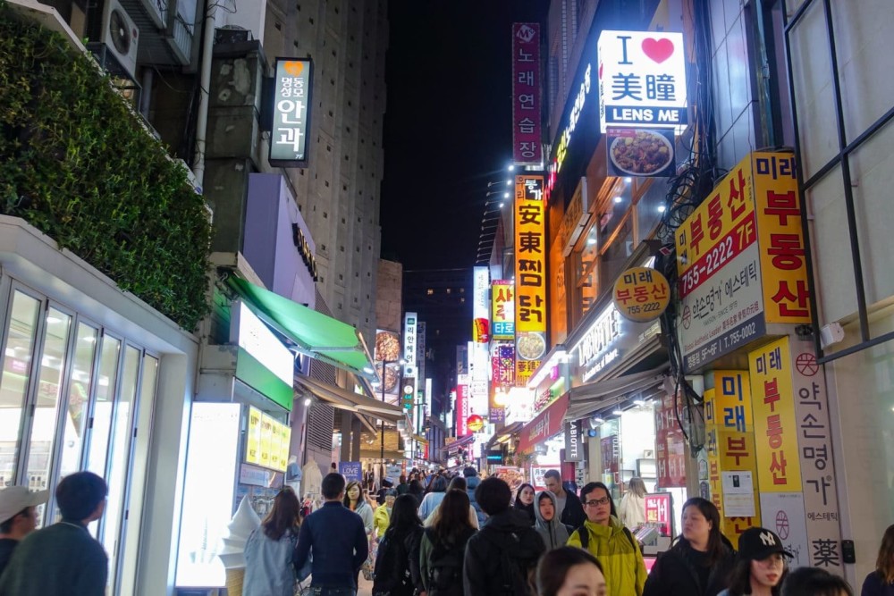 家喻户晓的明洞夜市靠近南大门市场、首尔站和市政厅,是首尔最繁忙的户外夜市。该地区是一条购物街,到处都是潮流服装和美妆店。