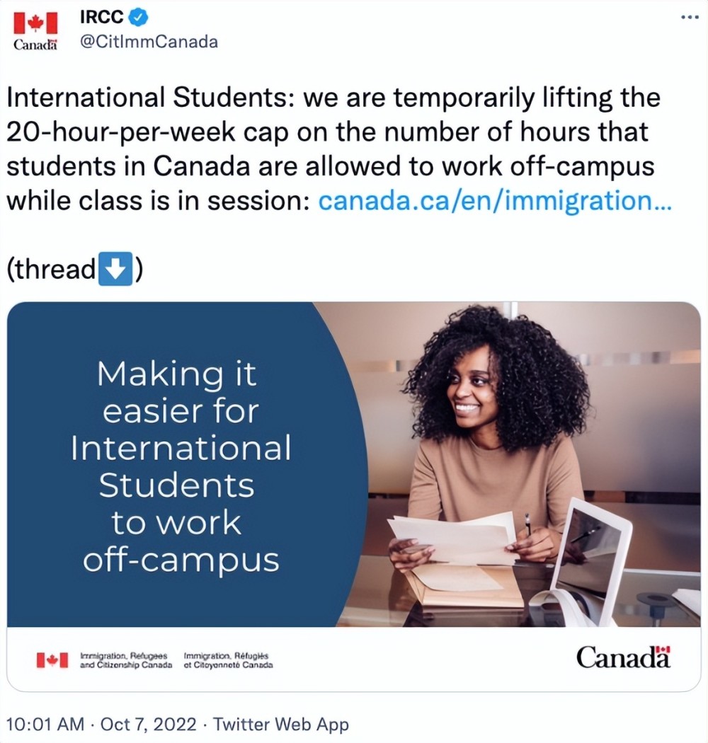 一、加拿大移民部部长肖恩·弗雷泽 (Sean Fraser) 今天宣布,从2022年11月15日至2023年12月31日,在加拿大留学学签允许工作的国际学生,将不受每周20小时规定的限制。