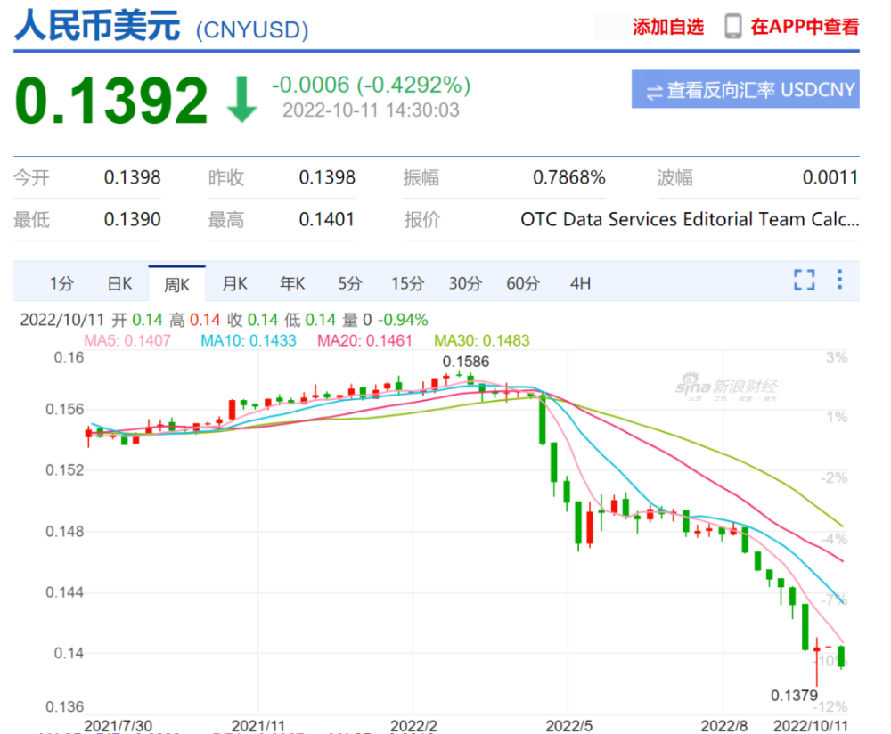 在岸人民币汇率从4月份的6.3354飙升到今天(10月11日)的7.1851。这就意味着,需要更多的人民币才能兑换同样价值的美元。