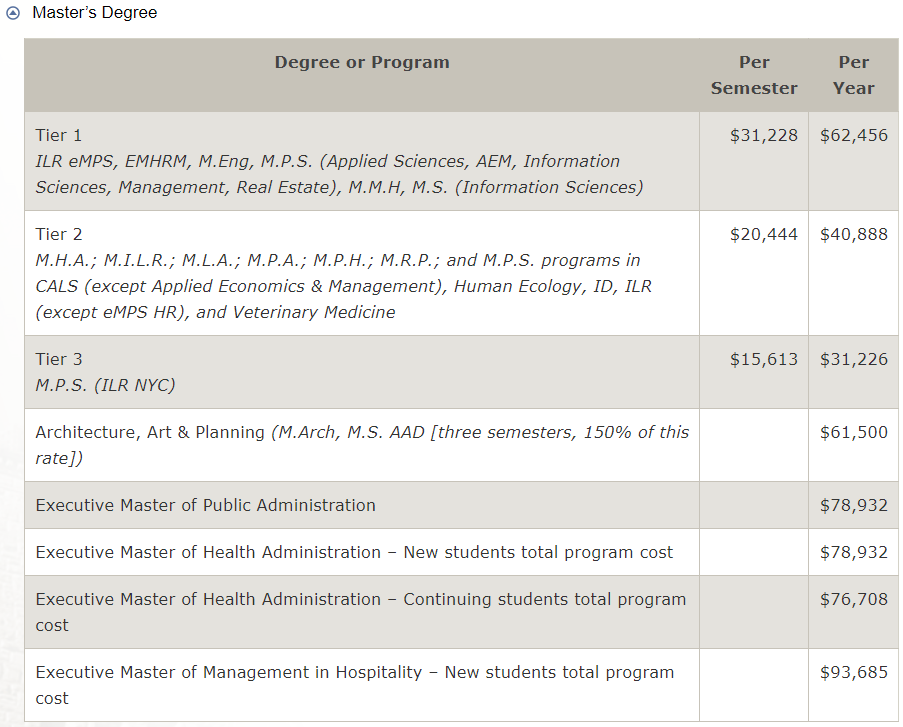 以康奈尔大学(Cornell University,简称Cornell )的硕士项目为例,常申的理工科和文商科硕士项目一年的学费分别约在31000美元-63000美元之间。