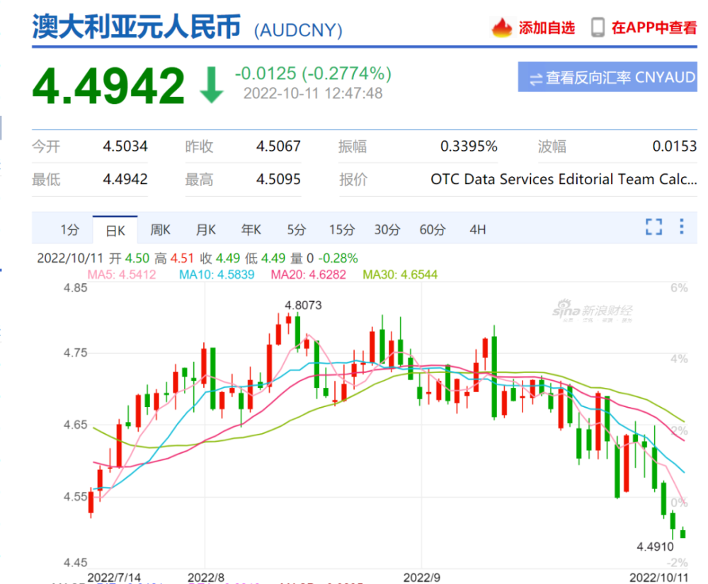 澳元汇率已跌至半年来最低值,跌破了1:4.5的关口。