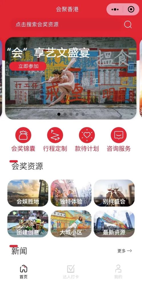 小程序全面展示香港会奖资源、创意行程、款待礼遇和最新动态,拥有搜索筛选及定制行程等功能,更有趣味打卡任务、积分兑换礼物等精彩活动。