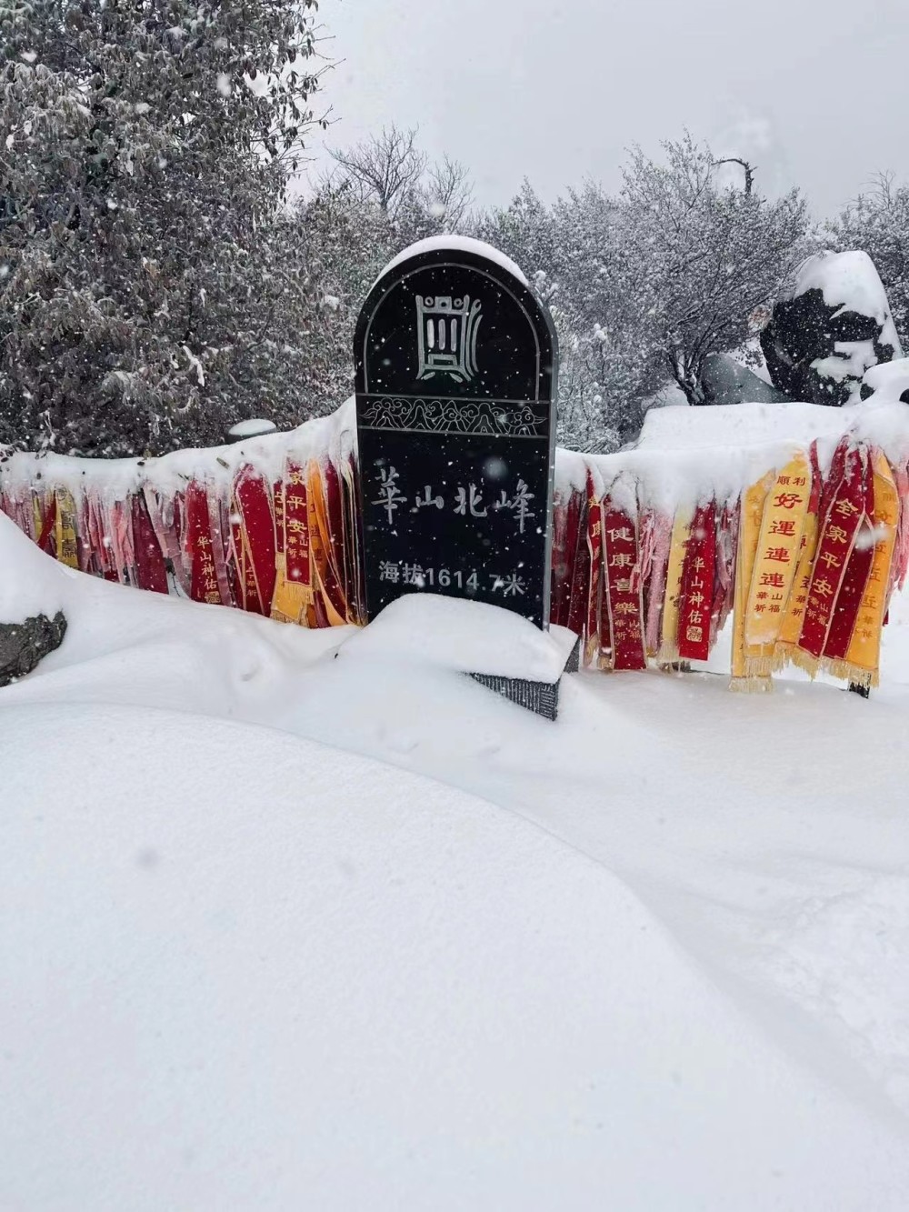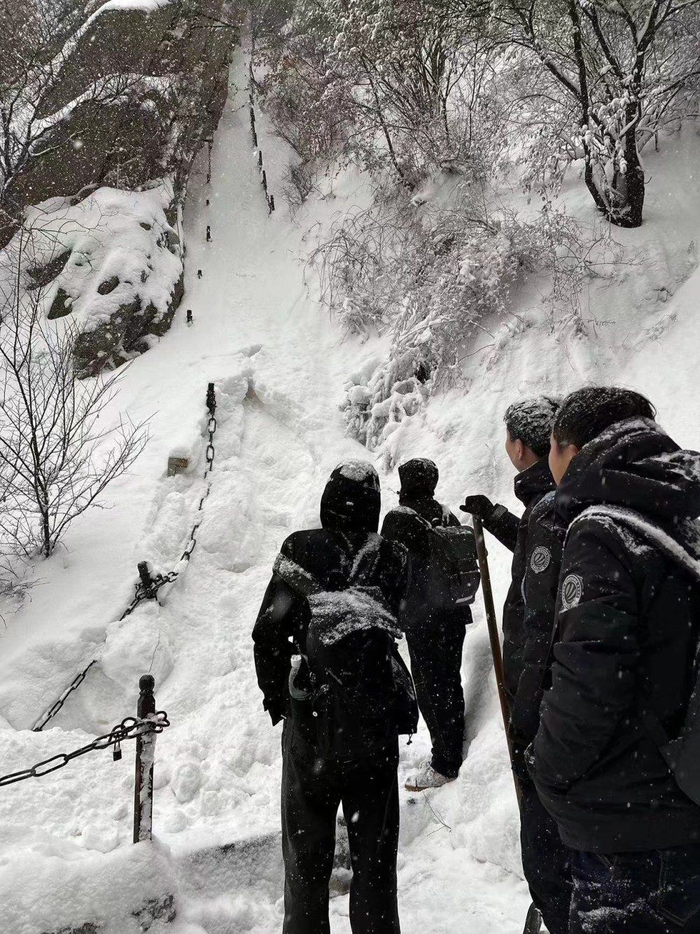 龚先生等人在庙宇中借了铁锹,男生4人轮流清雪,缓慢登山,“雪深大约40厘米”。登山路上,龚先生也不慎摔倒多次,“眼镜都丢了,手机屏幕摔碎了。”几人于当天12点半登顶北峰,其中第一个登顶的是来自湖南的小伙姓戴。戴先生拍下写有“华山北峰,海拔1614.7米”的石碑。“上山难,下山只花了1小时50分钟。”
