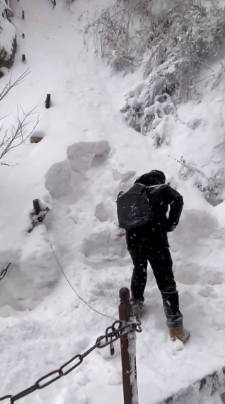 视频当事人龚先生介绍,14日上午7点,他和同事到达登山口,开始下雪,景区工作人员不建议登山。但一进入景区刷票了就不能退回,两人想既然已经来了就不想留遗憾。两人在登山口等待半小时后登山,后来队伍壮大与其他游客共6人,共4男2女结伴登山。