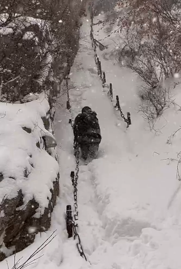 视频中,一身穿黑色外套男子拿着铁锹清雪,还有男子沿着露在雪地上的铁索艰难登山。鹅毛大雪不断飘下,覆盖在踩过的脚印上。积雪大概到了男子膝盖位置。