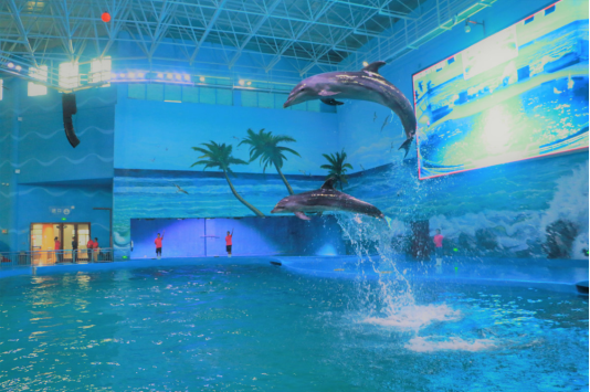 展馆内由亚马逊热带林区、海洋珊瑚礁鱼区、凶猛鲨鱼区、海底隧道区、极地动物区、梦幻水母区、科普展示区、海豚欢乐剧场、美人鱼剧场组成。去到这里,可以看到海豚表演、海狮互动表演、潜水员喂鱼表演及美人魚表演。