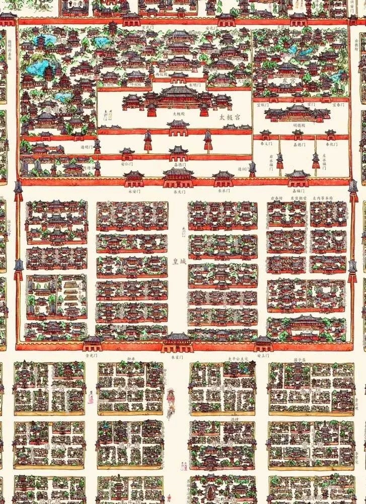 它的经营者决心放弃任何别出心裁的结构,而用所有的精力换取这座城市异乎寻常的尺寸。于是我们看到了一个布局极为规整的唐长安,正南正北,左右对称。总面积84平方公里,东西南北分别设置14条大街,将长安城划分为108个里坊,正中央贯穿南北的朱雀大街,足足有150米宽。