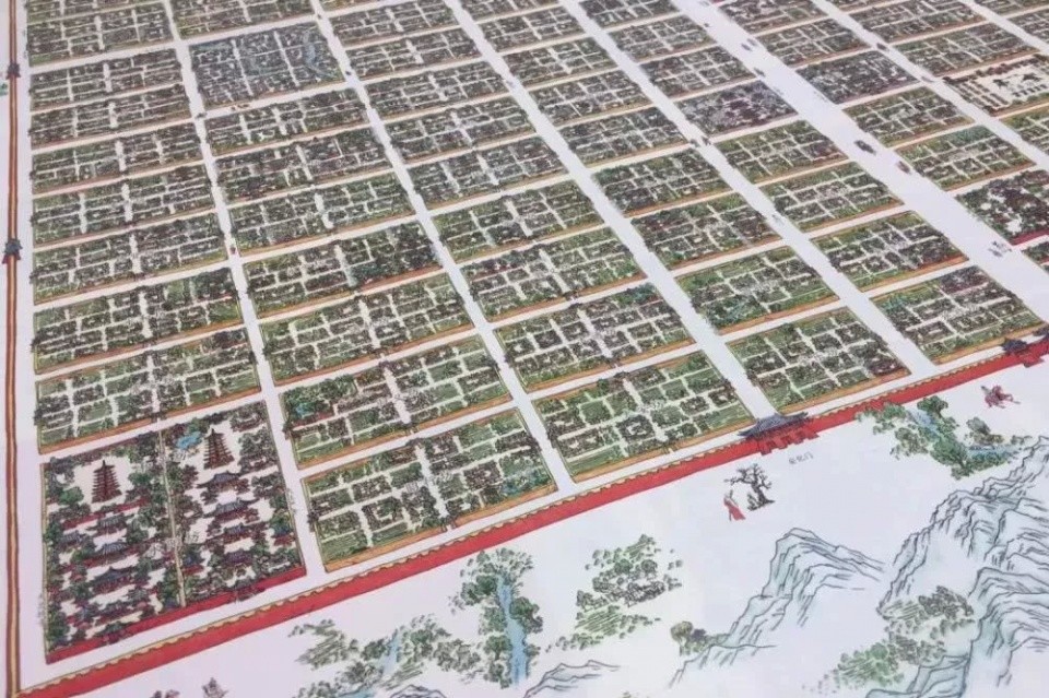 阡陌纵横的城市街道和里坊制度将居民区整齐归置,气势宏大的宫殿建筑群正对中央大街镇压全城,洒然出尘的寺观错落有致,东西分设贸易区各自为营,依势而建的公共旅游区四季皆景。
