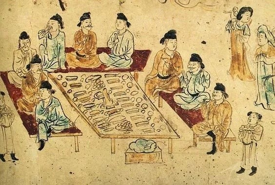 野宴图,陕西西安长安县南里王村中唐墓壁画,画中人们大多身着改良胡服