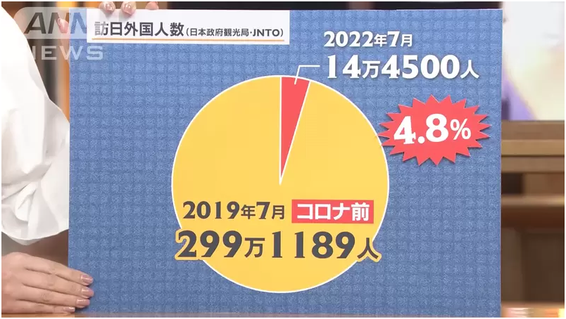 节目拿出疫情前2019年7月的统计,访日的外国人有高达299万人,再来看到2022年7月的观光客人数,14万人左右,这数字仅是2019年的4.8%。
