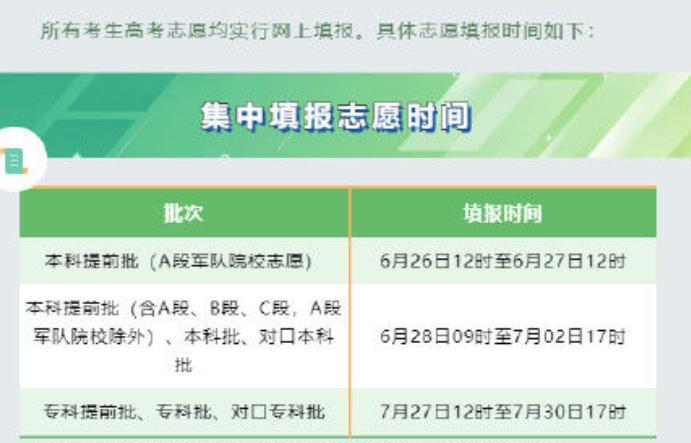 目前已经有12个省份公布了志愿填报的时间,本科提前批次的填报时间在6月26日到27日,本科提前批,本科批,对口本科批的填报时间则是在6月28日到7月2日,专科的提前批,专科批,对口专科批的时间是在7月27日到7月30日。