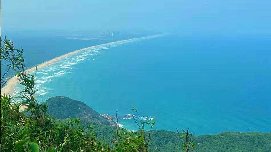 美丽的月亮湾像一钩初月,银白色的沙滩像一条缎带,涛涛的白浪犹如万马奔腾。此处水陆相间、蓝绿相融、动静结合,美不胜收。