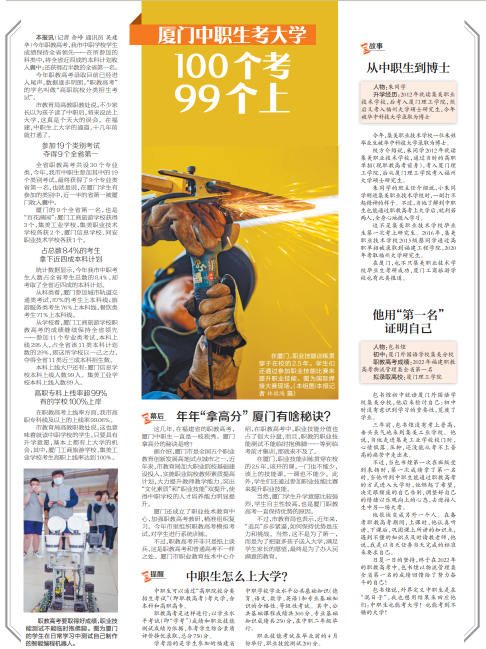 报道说,今年职教高考,厦门市中职学校学生成绩保持全省领先——在所参加的科类中,将全省近四成的本科计划收入囊中;还获得近半数的全省第一名。