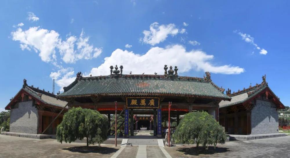 高墙厚垣环绕四周,建筑布局完整,整组建筑自南向北在中轴线上依次分别为照壁、山门、前殿、报厅、中殿、寝殿、墓冢。在主体建筑的两侧又分布着东、西戏楼、钟鼓楼、东西厢房等。