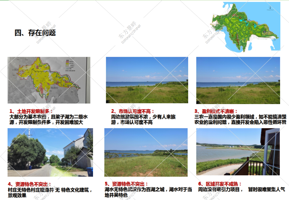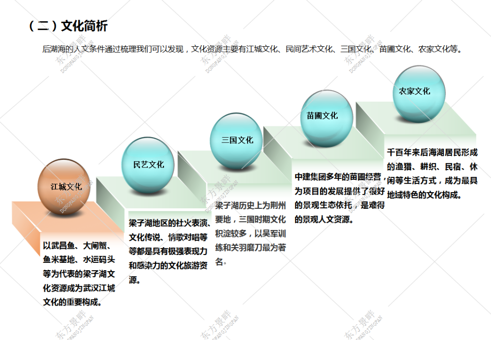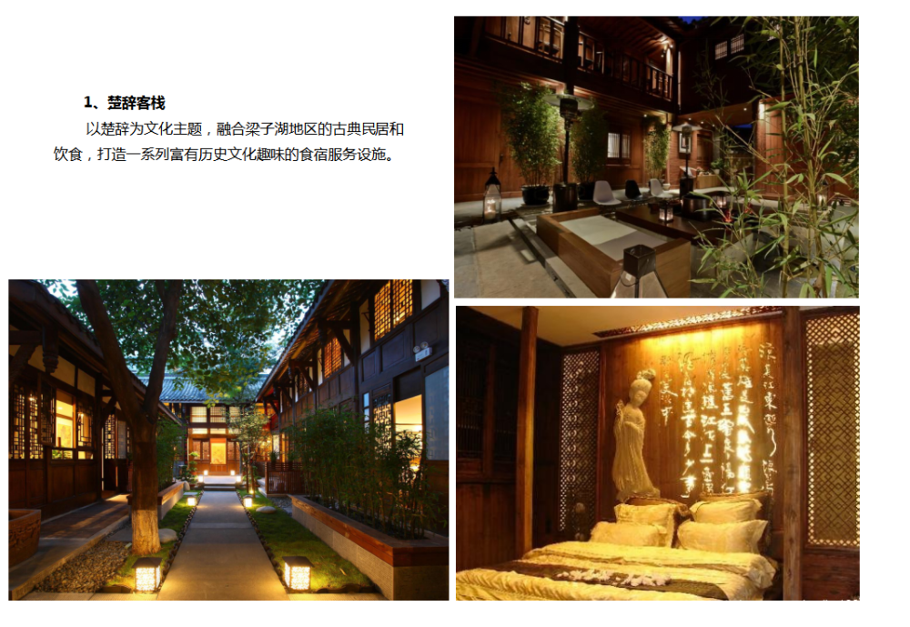 以项目所在地块及周边梁子湖湿地的生态基底为发展依托,本着保护第一,适度开发、产业联动、居旅共赢的发展原则,以武汉的江城文化为统领,并融合民间民俗文化、秦汉三国文化等地域文化,构建集农业休闲、滨湖度假、水上娱乐、湿地科考、民俗体验、拓展运动等旅游业态为一体的综合性亲水休闲度假区。