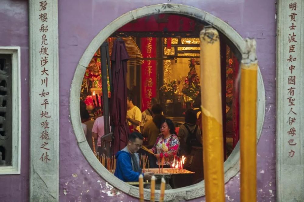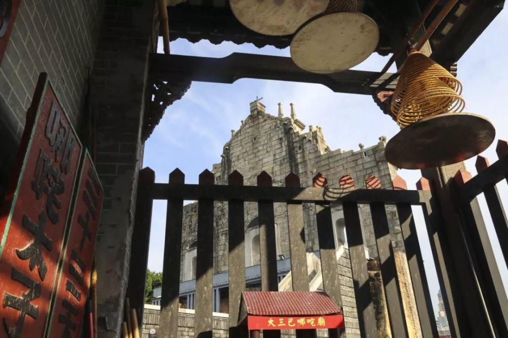 一前一后,前面有葡萄牙裔在大三巴牌坊驻足观望,后面有络绎不绝的传统渔民及后人在哪吒庙烧香祈福,明明如此违和,在这里却可以如此和谐。