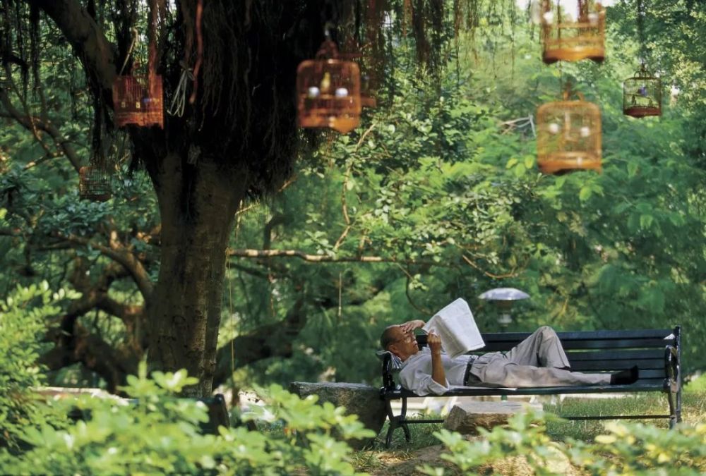 钱捍/ CTPphoto 澳门,白鸽巢公园里面,挂着鸟笼的树下,躺在椅子上阅读的老人