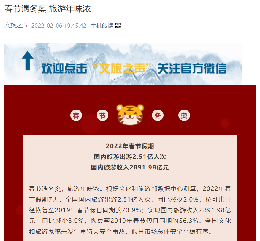 2022 年春节假期的最后一天,文化和旅游部官方网站和中央电视台等权威媒体发布了文化和旅游部数据中心测算的市场数据。