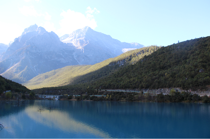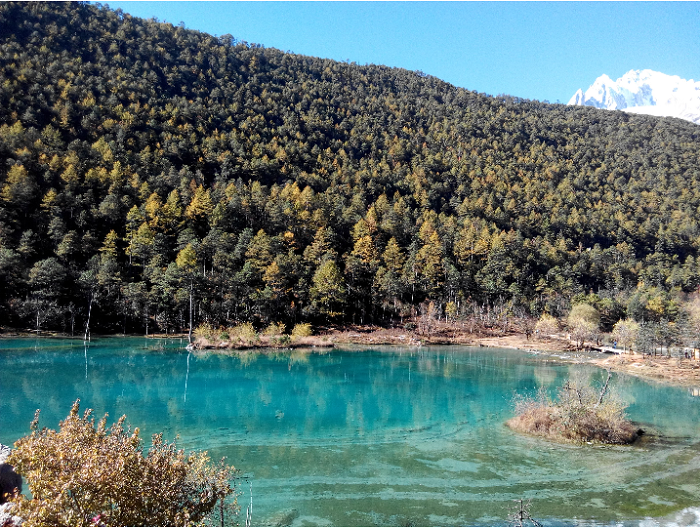蓝月谷的水是蓝色的,而且山谷呈月牙形,远看就像一轮蓝色的月亮镶嵌在玉龙雪山脚下,所以名叫蓝月谷。蓝月谷中的河水在流淌过程中因受山体阻挡,形成了四个较大的水面,玉液湖、镜湖、蓝月湖和听涛湖。