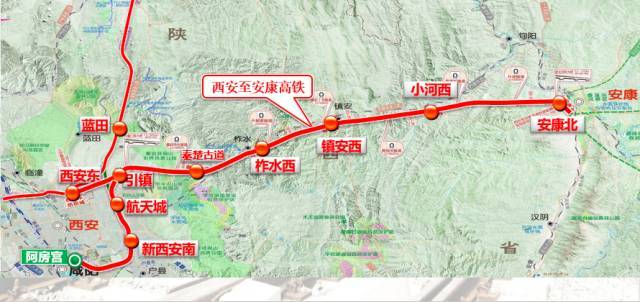 西康高铁对架构陕西省高铁网主骨架、完善国家高速铁路网布局意义重大。此线路自西安东站引出,穿越秦岭后,经柞水、镇安、旬阳至安康西站,正线全长170.4公里。全线设西安东、太河(营盘北)、柞水西、镇安西、桐木、安康西站6个车站。