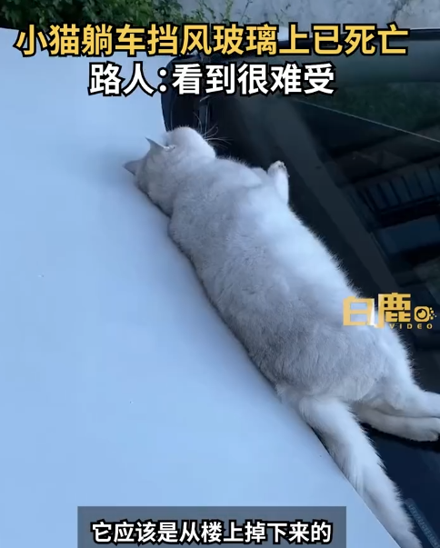 刘先生上班路上看到一只小猫躺在车上,走近发现小猫已无生命体征。刘先生表示,一开始以为小猫睡着了,觉得很可爱就摸了一下,结果发现它浑身冰凉,车前挡风玻璃这块区域没有灰尘,抬头看到楼上有几家没有封窗,自己猜测小猫可能是从六楼以上掉落的。车子没有受损,车主人将车开走后把小猫埋了。自己也曾养过猫,当时看到这一幕非常难受。