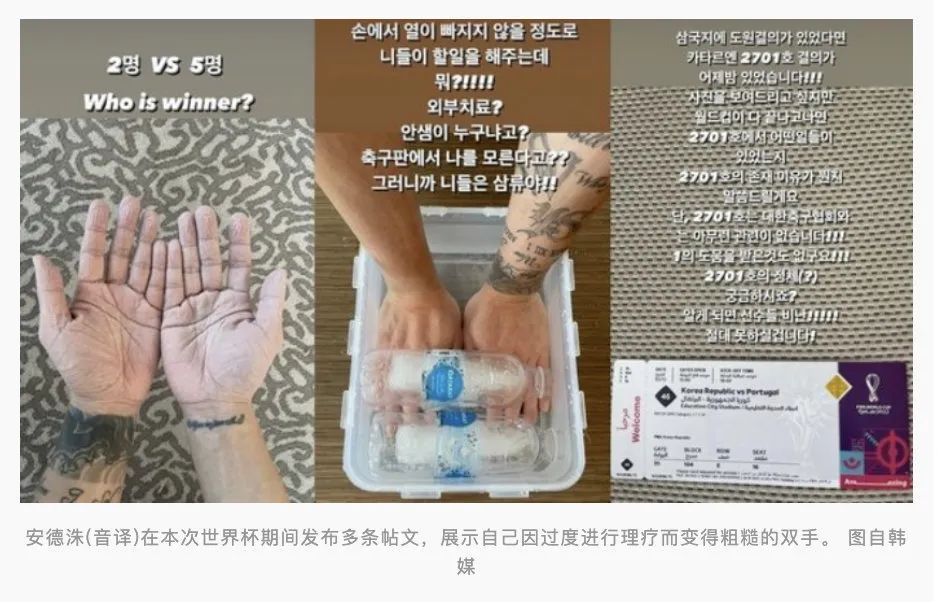 而在其发布的另一条帖文中,安德洙(音译)还拍照展示了自己因过度进行理疗而变得粗糙的双手,并向韩国足协和韩国队随行医疗队说道,“我做了你们应该做的事”,“还称我这是‘外部医疗’”?他还写道,“待世界杯结束后我会对外界告知一切。到时,各位一定不会再责备我们的选手”。